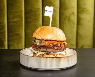 Bułka maślana, sos klasyczny, rukola, pomidor, 2x wołowina 180g, cebula czerwona, ogórek kiszony, bekon -