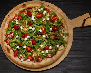 sos, ser, rukola, ser feta, pomidorki koktajlowe -