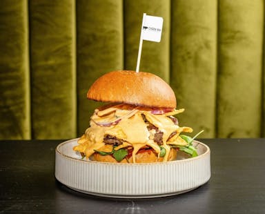 Bułka maślana, sos klasyczny, sałata lodowa, konfitura z czerwonej cebuli, wołowina 180g, 2x ser cheddar, camembert, ser lazur, ogórek kiszony -